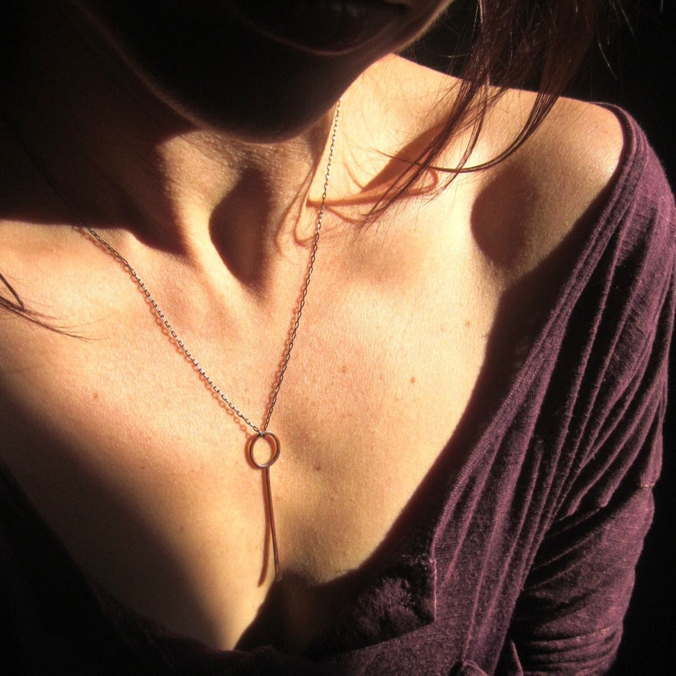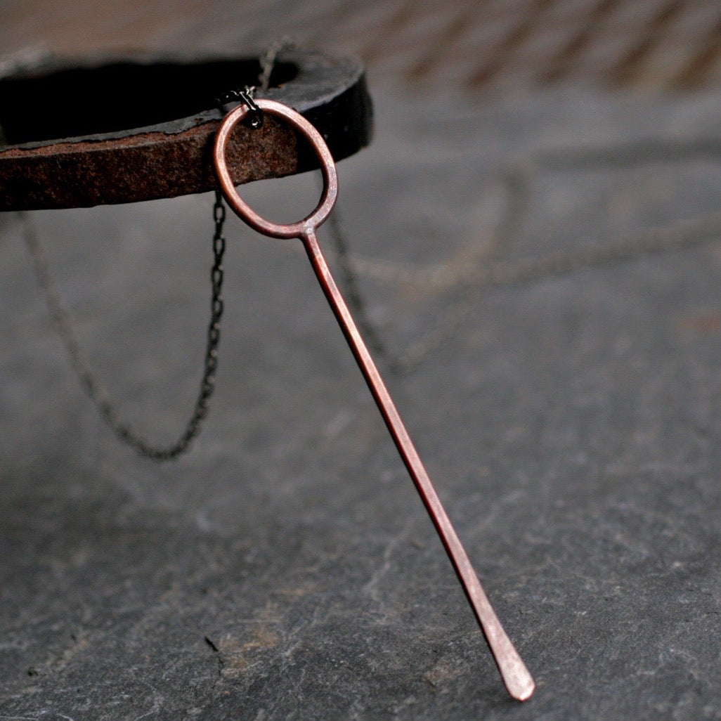 Hand brazed and forged delicate drop pendant. Crafted in your choice of brushed brass or rustic copper with natural heat patina. Pendant measures approx. 2 1/4" long. Strung on an 18 1/2" ultra fine gunmetal chain with lobster clasp.